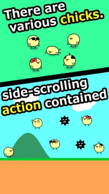 Earning coins in a side-scrolling action mini game, grow your chicks and meet lots of chicks.
