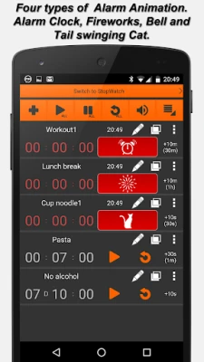 Each timer can have different name, alarm sound, length, color label, vibration on/ off and alarm animation including a cute tail swinging cat alarm animation.