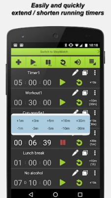 • Expanding time of active timers easily (by quick menu, single tap and double taps)
