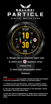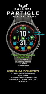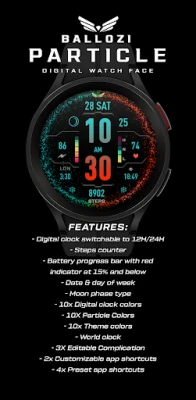 BALLOZI PARTICLE is a modern unique particle inspired watch face for Wear OS. It was first published in Tizen and improved in Wear OS. Works great on round smartwatches but not suitable for rectangular and square watches.