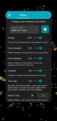 If you feel like you want to give your critters a nudge in the right direction, enable Hand of God to herd (by swiping) or beckon (by pressing) particles to your whim.