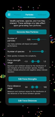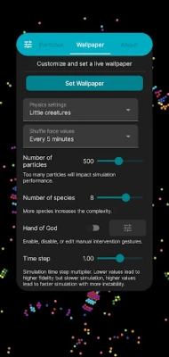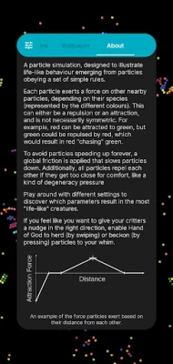 A particle simulation, designed to illustrate life-like behaviour emerging from particles obeying a set of simple rules. Set as a live wallpaper, and turn your phone into the ultimate Petri dish!